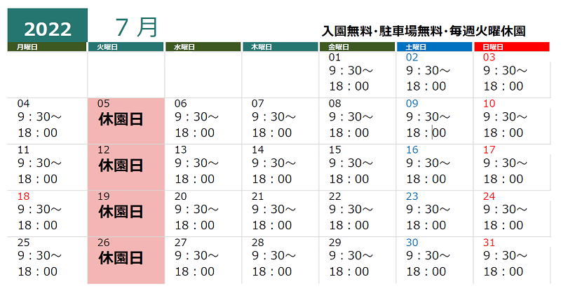 るるパーク(るるパークは大分農業文化公園の新愛称です)の開園時間は3月~6月の間 9:30~17:00 、休園日は毎週火曜日です。