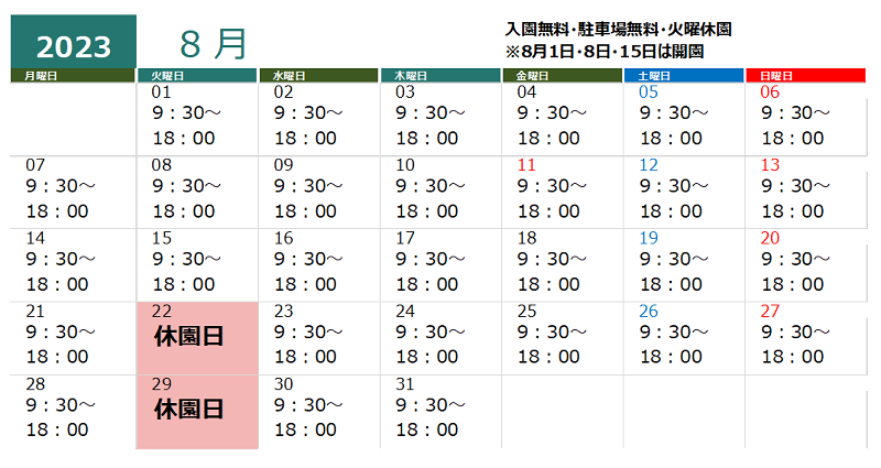 るるパーク(るるパークは大分農業文化公園の新愛称です)7月~8月の開園時間は 9:30~18:00 、8月21日(月)までは毎日開園します。入園無料・駐車場無料です。