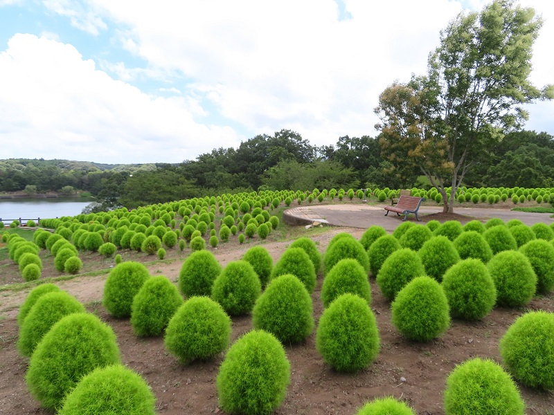 フラワーガーデンでは約4000本のコキアを栽培しています。昨日から台風対策として、コキアに支柱を立てる作業を行っています。