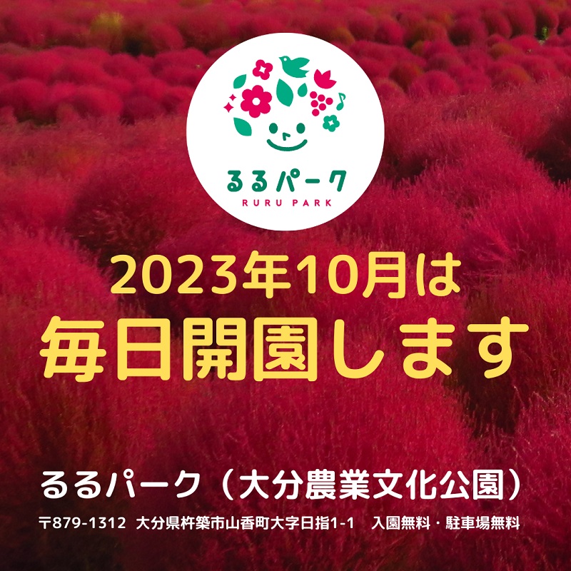 るるパーク(るるパークは大分農業文化公園の新愛称です)9月~11月の開園時間は 9:30~17:00 、通常休園日は毎週火曜日ですが10月はお休みなしで毎日開園します(11月6日まで毎日開園)。入園無料・駐車場無料です。