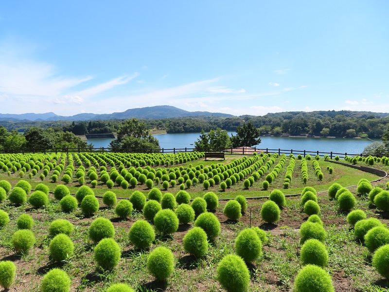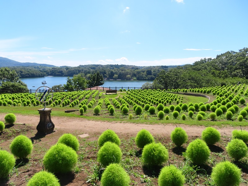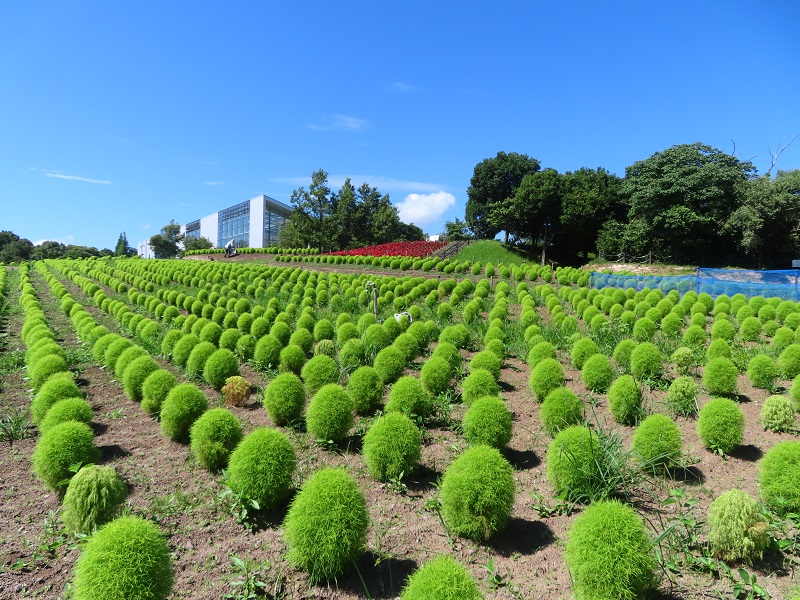 正面ゲートから徒歩3分・フラワーガーデンのコキアを撮影してきました(9時30分頃)。3連休の大雨以降、ぐいぐい大きく成長しています。大きいものでは背丈45cmくらいになっていますよ。