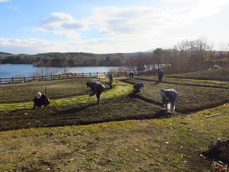 2019.12.12 ネモフィラSeason2!! 除草作業を行いました 本日は一斉作業日。スタッフ総出でフラワーガーデンの除草作業を行いました。 開始直後はご覧のとおり晴れていたのですが、雲が太陽を隠し、風も強くなってきて(+_+) これも来年春、お客様に素敵な景色をご覧いただくため。スタッフ一同頑張りました!