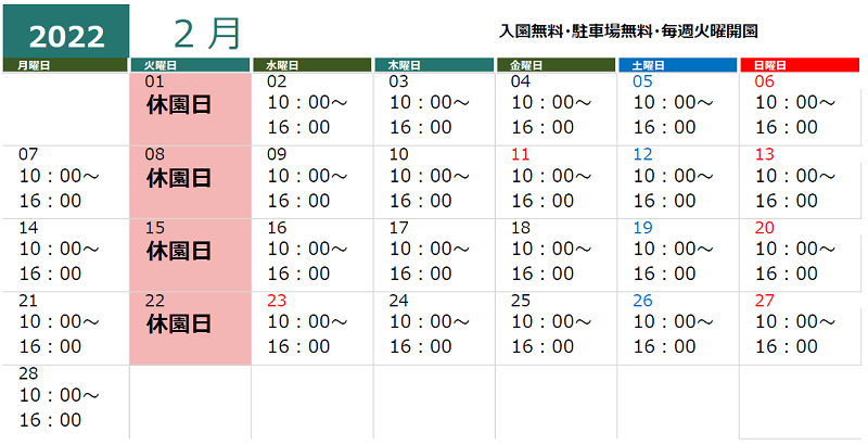 大分農業文化公園の開園時間は12月~2月の間 10:00~16:00 、休園日は毎週火曜日です。各施設の営業時間は下記のとおりです。