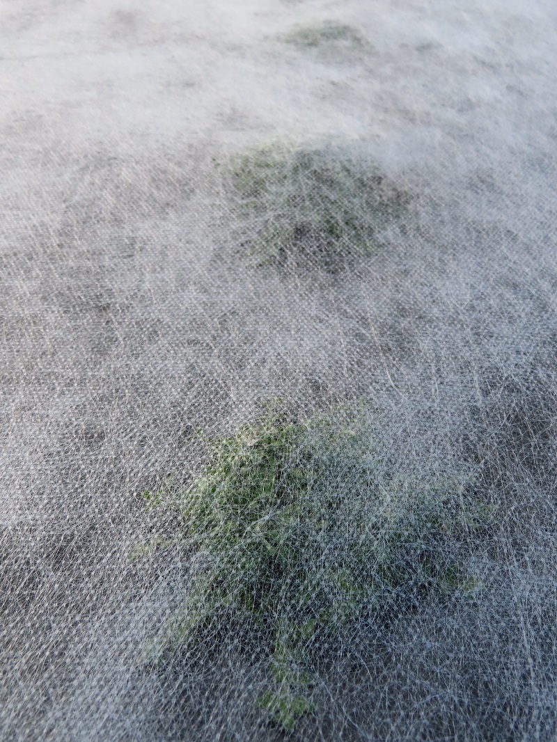 フラワーガーデンは霜よけの白い不織布でおおわれています。