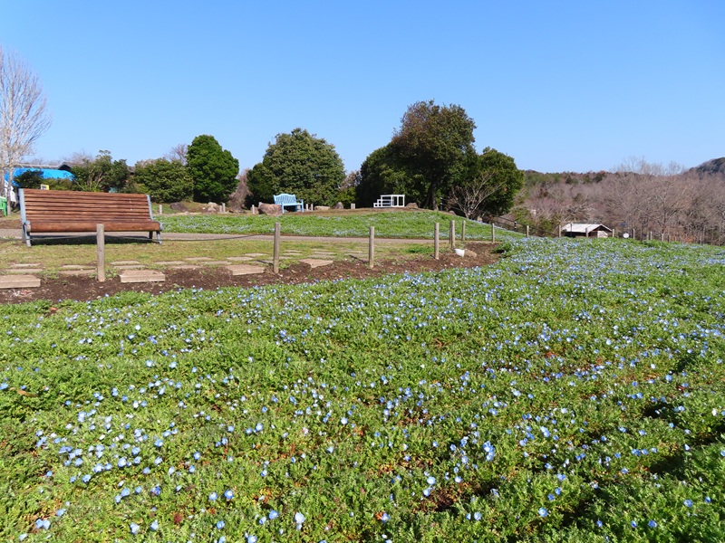 本日の(令和8年3月21日)大分県杵築市・るるパーク(大分農業文化公園)フラワーガーデン・ネモフィラ開花状況をお知らせします。全体としては一部咲きですがダム湖側の斜面は毎日開花がすすんでいます。画像はすべて朝9時過ぎに撮影しました。