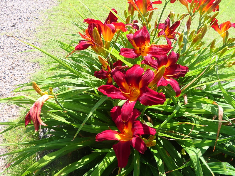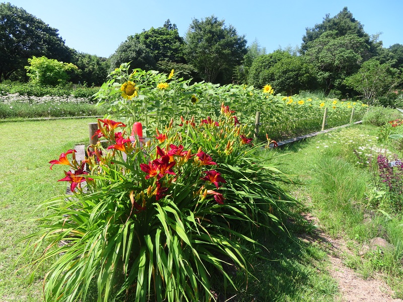 正面ゲートから右に徒歩3分・ハーブガーデンではヘメロカリスが開花中です。全部で5株くらいしかないのですが、花のサイズが大きいのと花の数が多いのとで目立っています。ヒマワリのすぐ隣で咲いています。