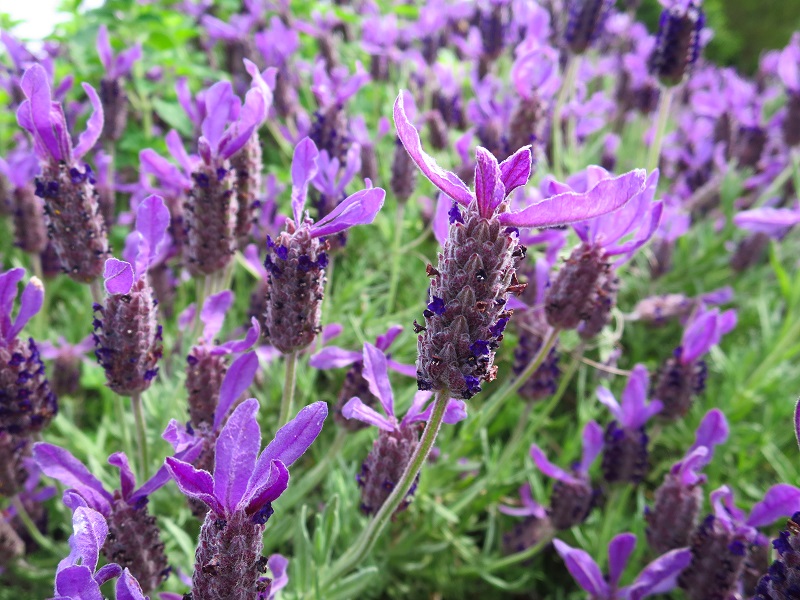 ハーブガーデンでは「フレンチラベンダー」が開花しています。てっぺんについているリボンのようなものは花弁ではなく葉だそうですよ。
