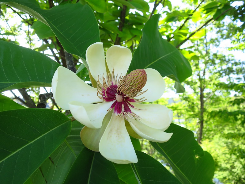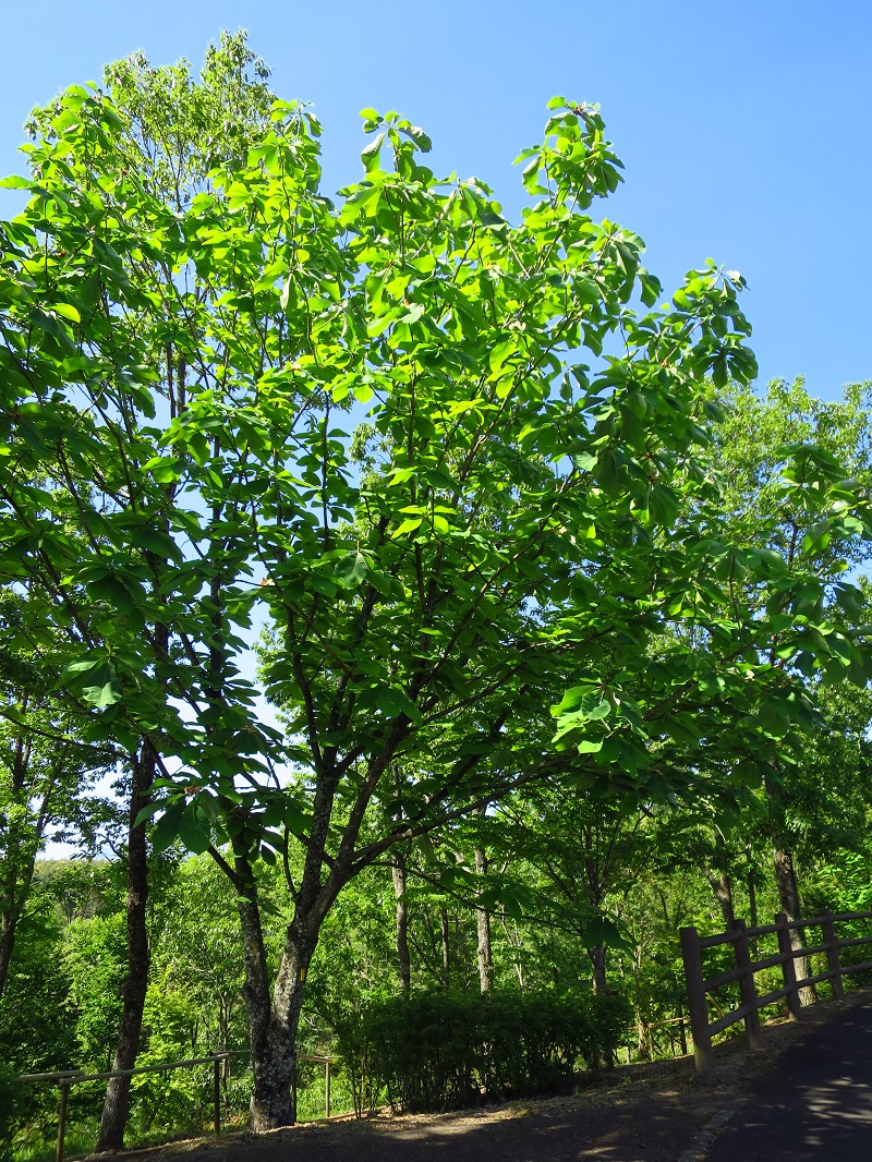 正面ゲート入ってすぐ、右手側にある大型遊具「プレイファームランド」の下を通りぬけて1分ほど歩くと大きな大きな木が目に飛び込んできます。「ホオノキ(朴の木)」です。