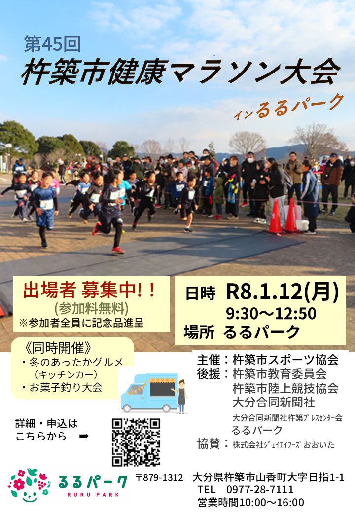 ところで、るるパークでは来年1月12日(月・祝)に杵築市スポーツ協会主催「第45回杵築市健康マラソン大会」が開催されます。新春の一日、るるパークで走ってみませんか?小学生~一般まで全20種目、1.2km~3.4kmのコースで参加無料です。
