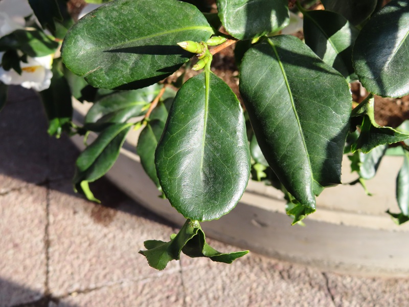 今日ご紹介するのは屋内つばき園で開花中の「梵天白(Bonten-jiro)」というツバキ。白の一重咲きですが、この品種は葉っぱに注目してください。