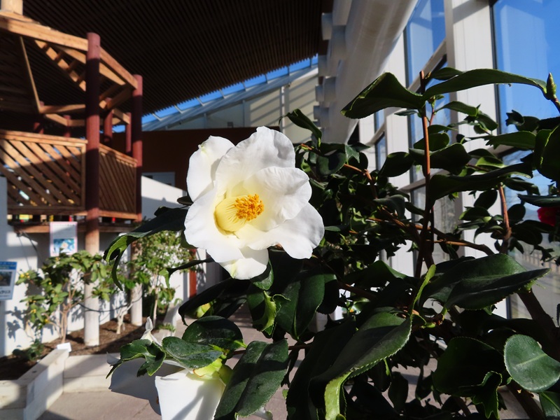 東ゲートから徒歩3分の場所にある屋外つばき園(国際優秀つばき園に認定されているのはこちら)では約400品種を植えていますが、2月上旬の大寒波の影響でしょうか、ほとんどがつぼみです。中にはよく咲いている木もありますが(「夢」という品種とか)見ごろはもう少し先になりそうです。