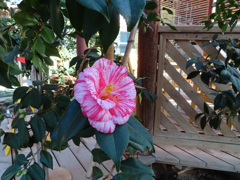 正面ゲートから左に徒歩3分・屋内つばき園では「ヘイカキンカチャ(平果金花茶)」と「蝦夷錦(Ezo-nishiki)」が咲き始めていました。屋内つばき園では約100品種100本のツバキを栽培していますが全体としては ほとんどがつぼみ です。