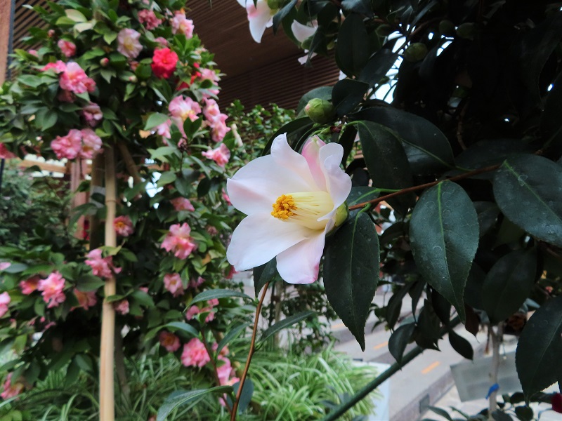 正面ゲートから徒3分・屋内つばき園では約20品種のツバキが咲き始めています。今日ご紹介するのは「月見の宴(Tsukimi-no-en)」という品種です。