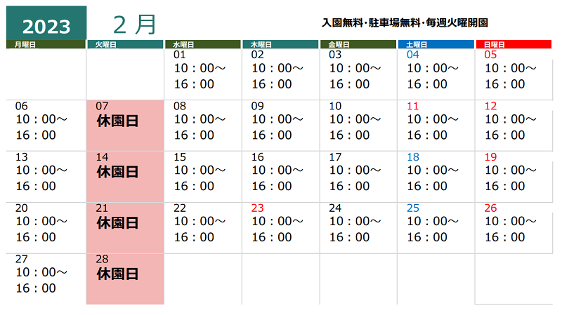 るるパーク(るるパークは大分農業文化公園の新愛称です)12月~2月の開園時間は 10:00~16:00 、休園日は毎週火曜日です。