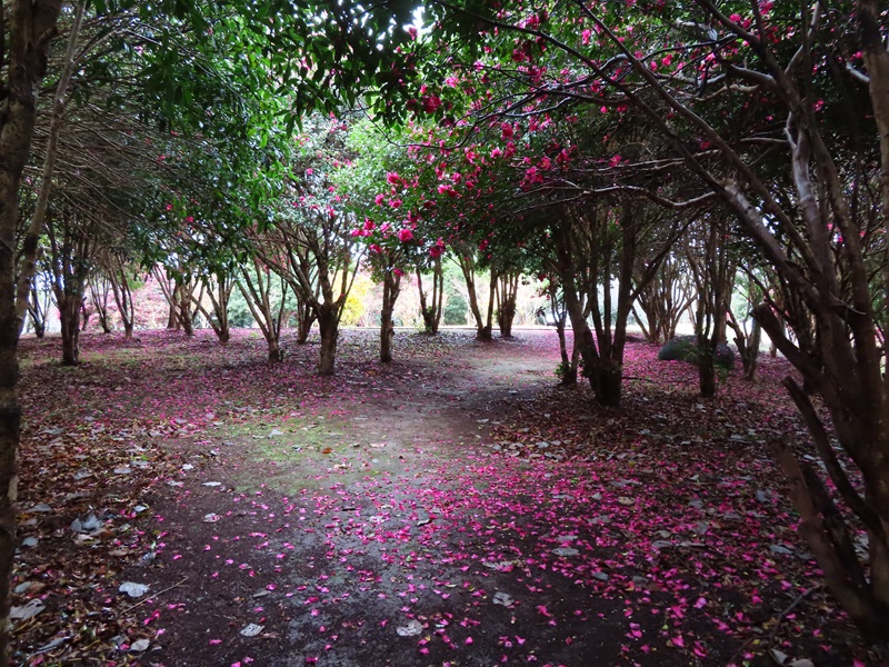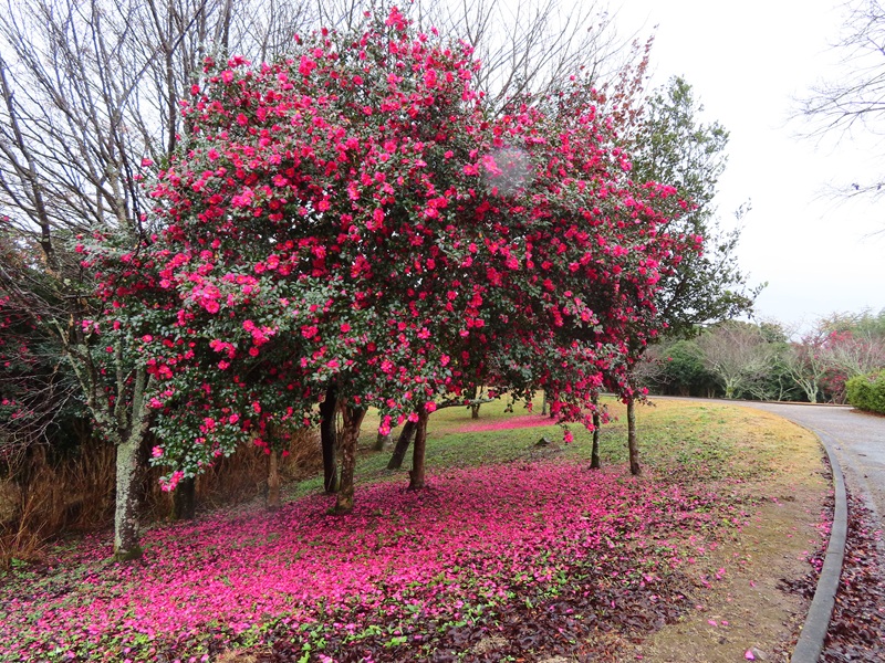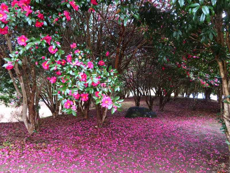 10時頃に東ゲートから徒歩10分・花木園(かぼくえん)に行ってきました。ここにはウメやロウバイ、ハナモモなどを植えているんですが、今はサザンカが開花しています。毎年サザンカは花を散らせてピンク色のじゅうたんを描き出してくれるのですが、今年もついに登場です!