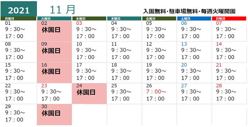 大分農業文化公園の開園時間は 9:30~17:00 です。休園日は毎週火曜日ですが、11月23日は祝日のため開園、翌日11月24日(水)は休園します。