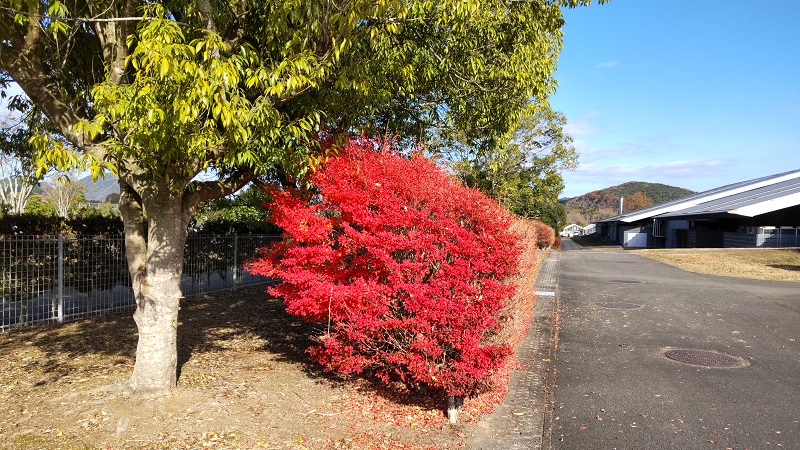 バックヤードを歩いていると遠目に赤く紅葉した真ん丸な木を発見!
