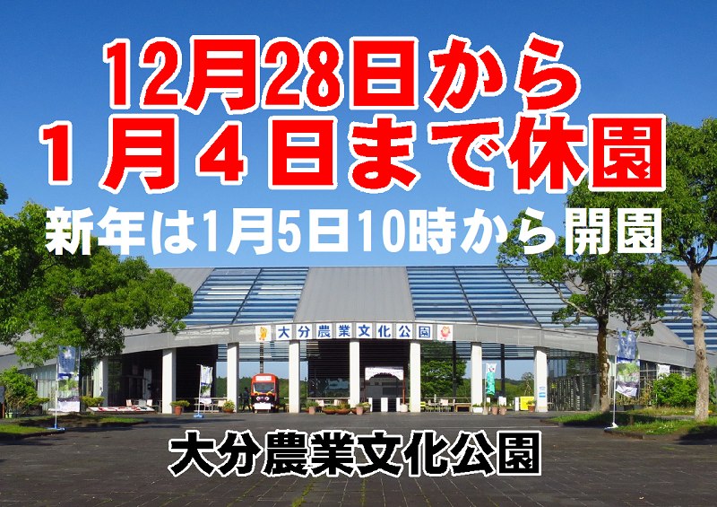 大分農業文化公園の開園時間は12月~2月の間 10:00~16:00 、休園日は毎週火曜日です。年末年始、令和3年(2021年)12月28日(火)~令和4年(2022年)1月4日(火)は休園させていただきます。