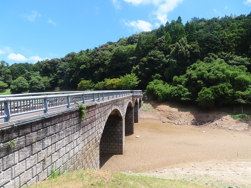 堰堤(えんてい/ダムをせき止めている部分)を通っている時に「もしかして…」と思いめがね橋まで行ってきたのですが、想像通りめがね橋の下が干上がっていました…!
