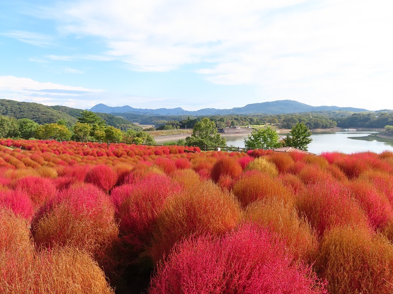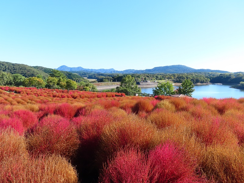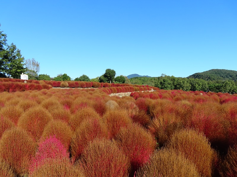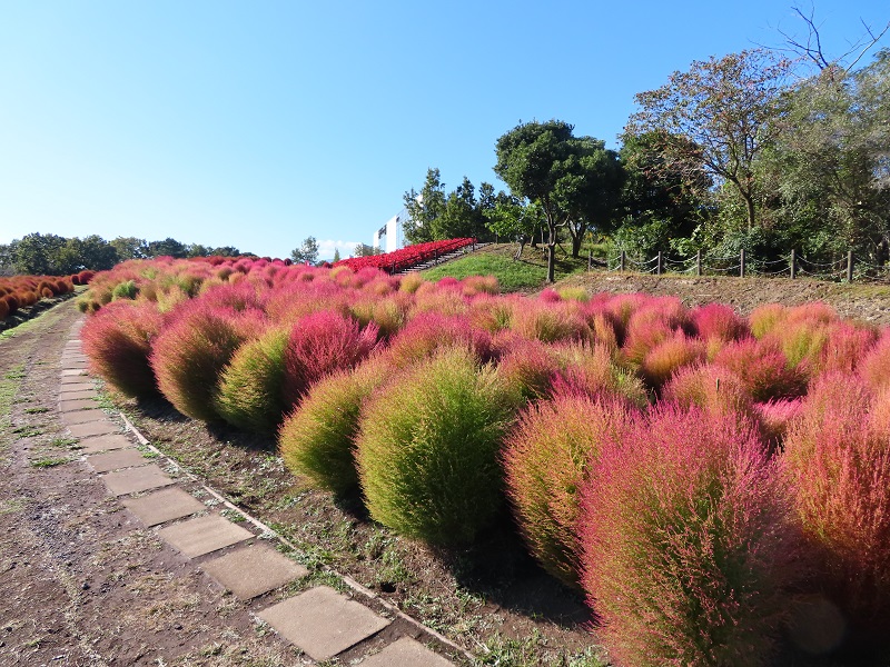 10月23日(土)9時前にフラワーガーデンのコキアを撮影しました。遅く紅葉するタイプのコキアがさらに色付いてきました。
