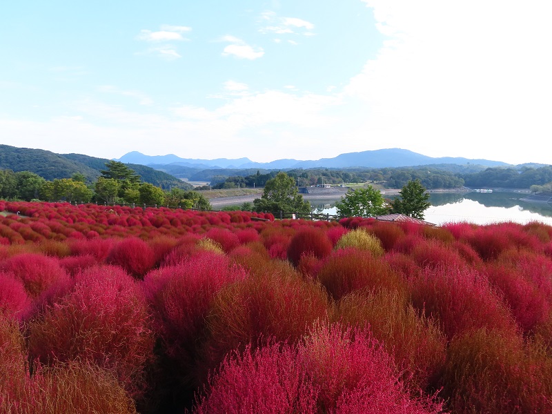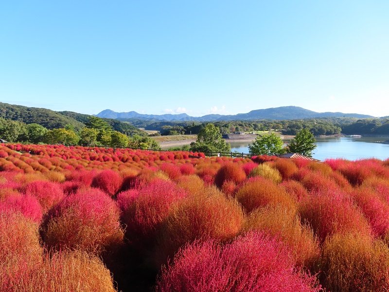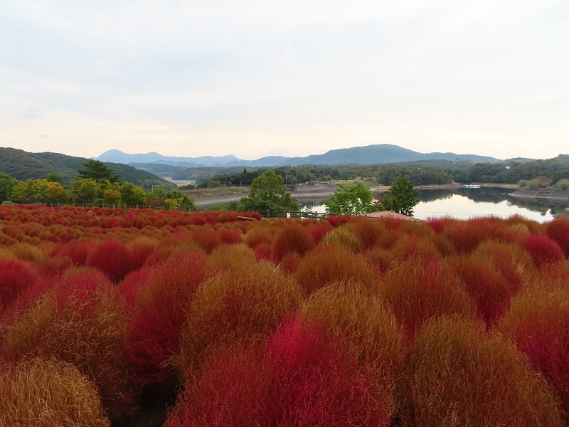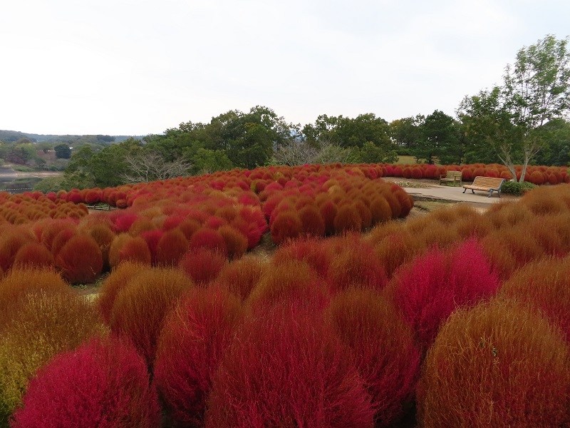 10月25日(月)9時すぎにフラワーガーデンのコキアを撮影しました。遅く紅葉するタイプのコキアが見ごろです。