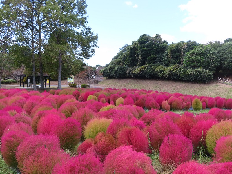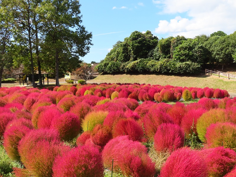 東ゲートから徒歩10分「四季の花畑」には約1000本の晩生コキアを植えています。