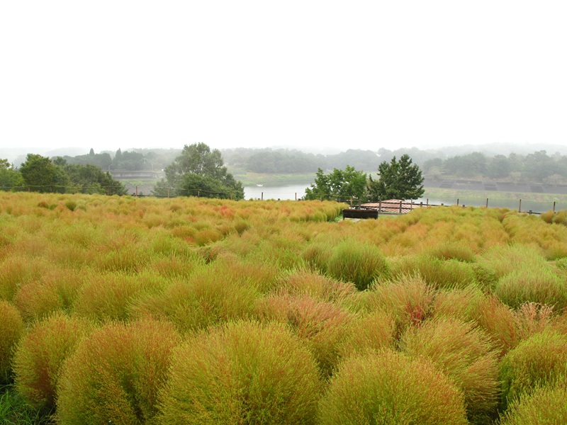 細かい雨が降る中、正面ゲートから徒歩3分・4000本のコキアを栽培しているフラワーガーデンで撮影をしてきました。まもなく紅葉はじめとなりそうですよ。どうぞお楽しみに。