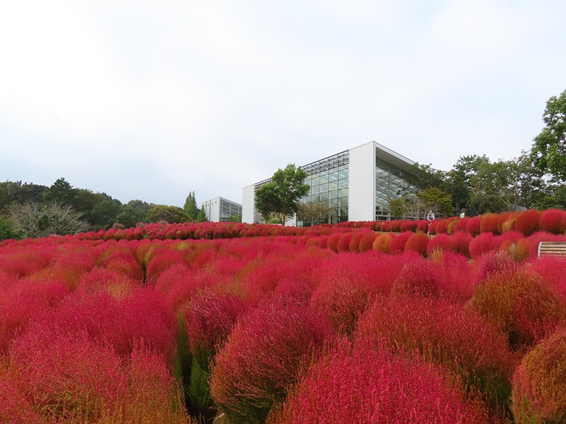 朝9:00すぎ、正面ゲートから左に徒歩3分・フラワーガーデンのコキアを撮影してきました。約4000本のコキアは見ごろを迎えています。