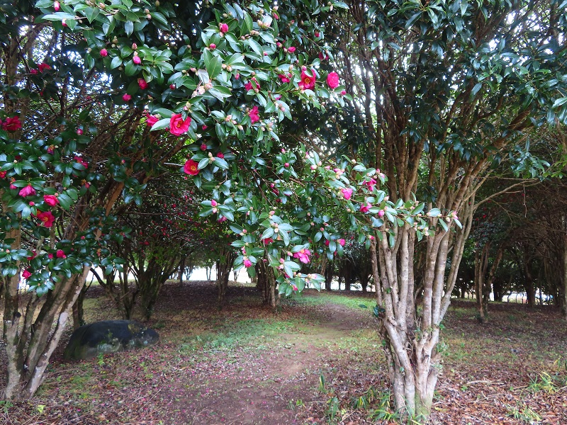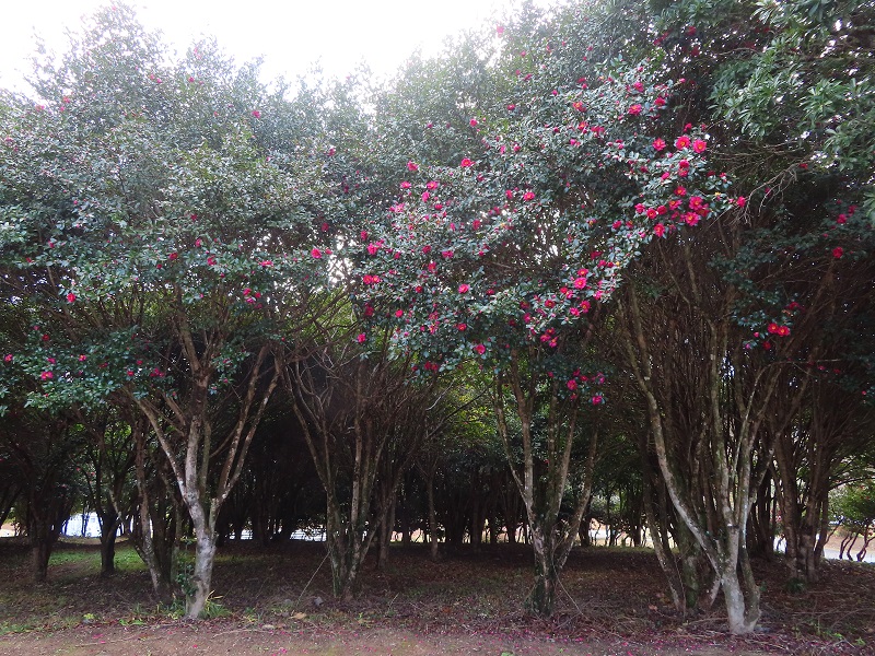 ▼花木園(かぼくえん)で撮影・例年だとサザンカの花びらが散ってピンク色のじゅうたんが登場するのですが…