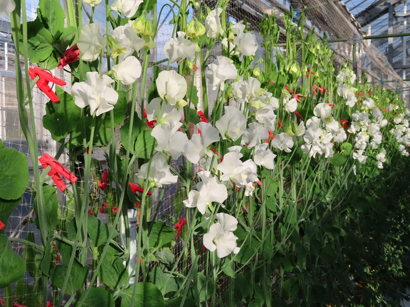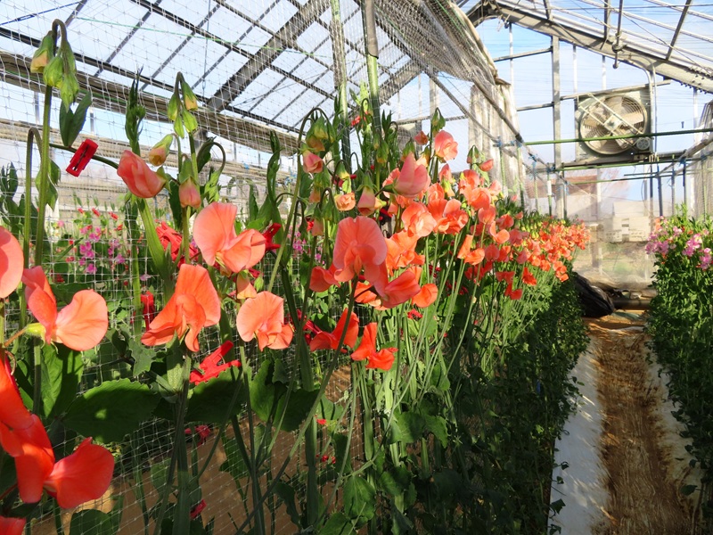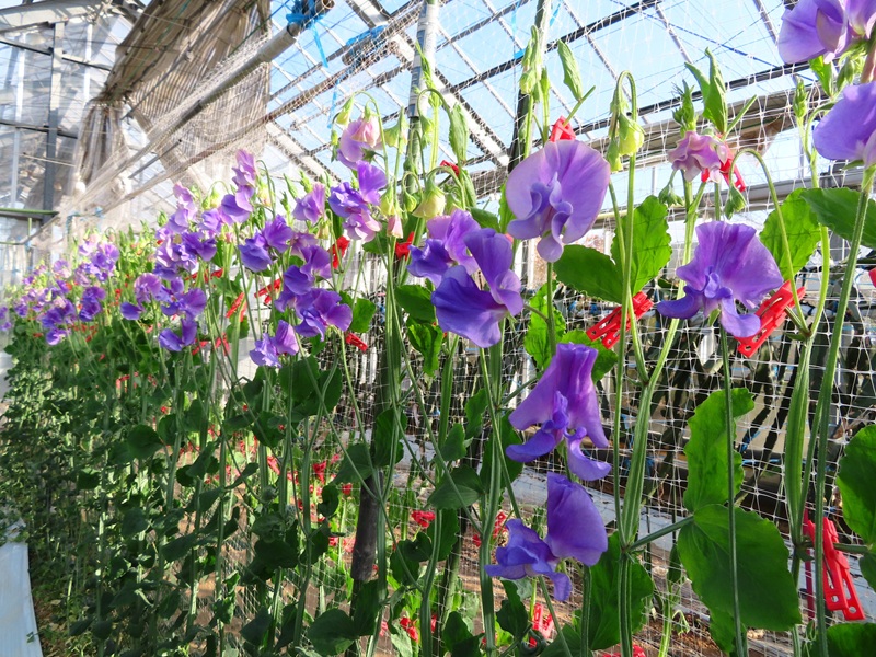 ところで、るるパーク東ゲートから徒歩3分・ガラスハウスではスイートピーが咲き始めました(ガラスハウスには現在関係者以外入室できません)。