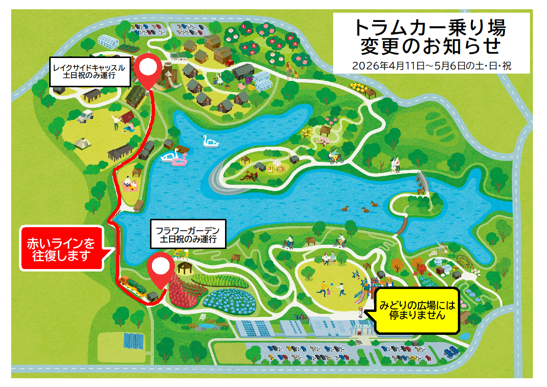 るるパークでは土・日・祝日にトラムカー「はなちゃん号」を運行しています。 ※平日は運行していません。 令和8年4月11日(土)~5月6日(水・振休)の土・日・祝日は上記マップのように乗り場が変更になり…