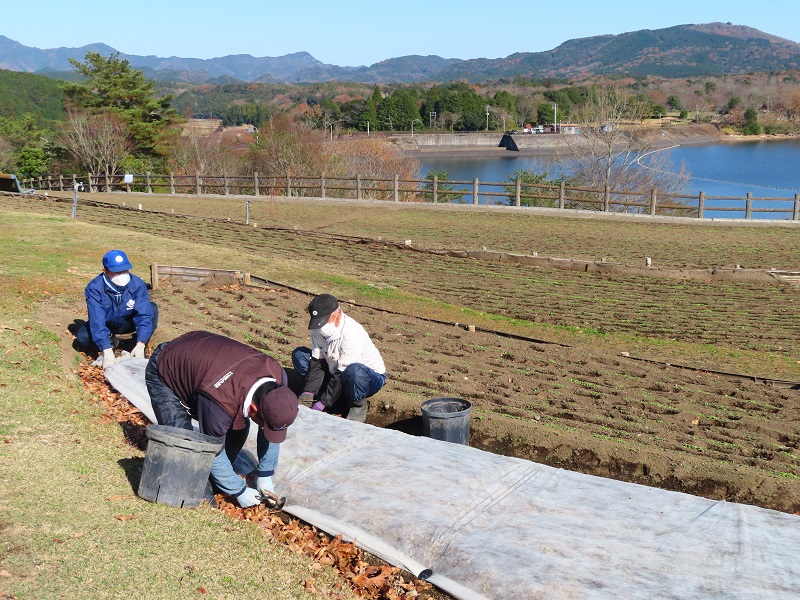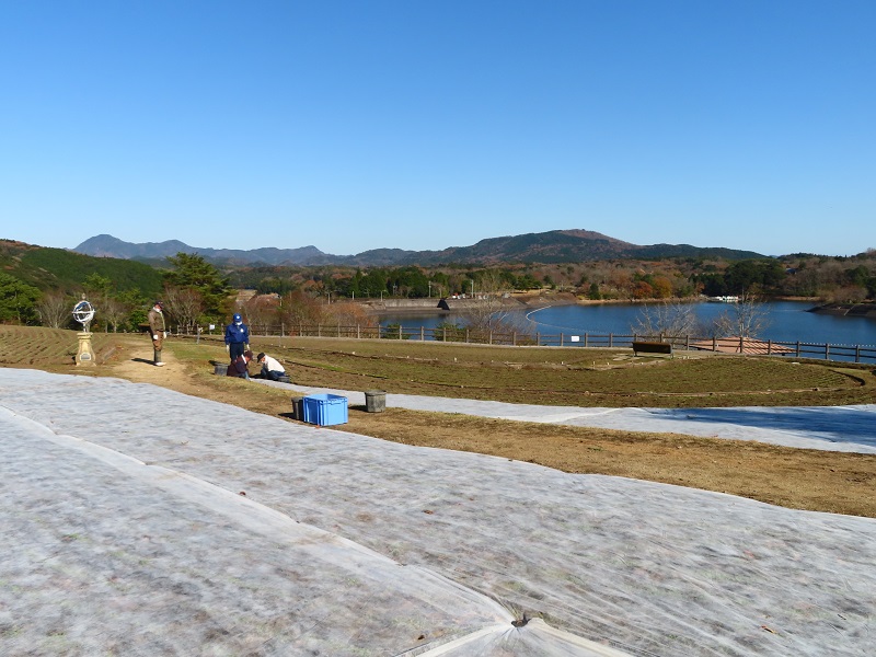 ▼フラワーガーデンでは月曜日から寒さ除けの不織布をかける作業が始まっています。