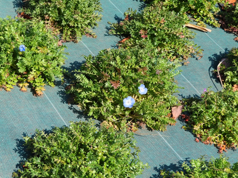 皆様ご承知のとおり、るるパークの正面ゲートから徒歩3分・フラワーガーデンでは70万本のネモフィラを栽培しています。霜よけの白い不織布をじわじわと外しているところです。