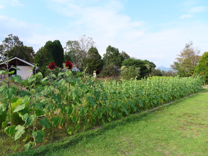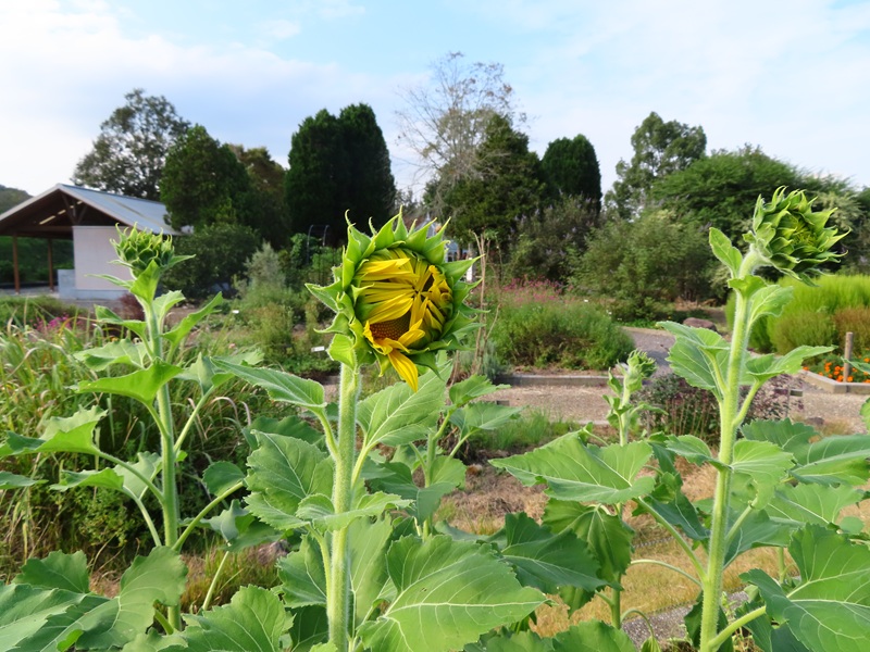 ハーブガーデンの赤いヒマワリ(全部で20本くらい)開花中/白いヒマワリは終了しました/黄色のヒマワリの開花はもう少し先