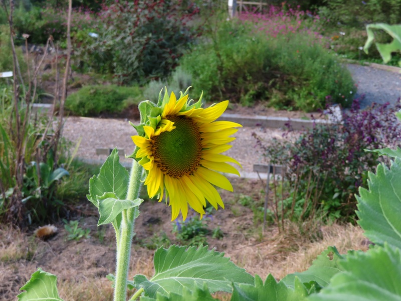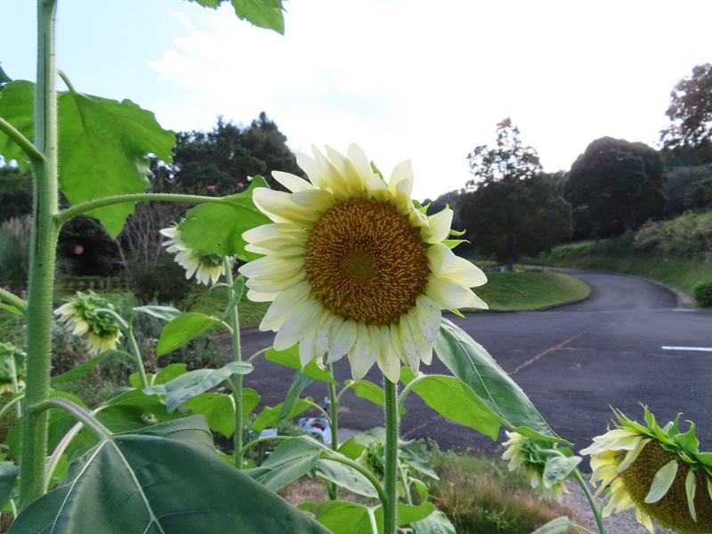 正面ゲートから右に徒歩3分・ハーブガーデンでは赤いヒマワリが開花中です。ヒマワリの花期はとても短いのでお早めに鑑賞してくださいね。画像は全て昨日10月7日(火)16時頃撮影したものです。加工は一切していません。
