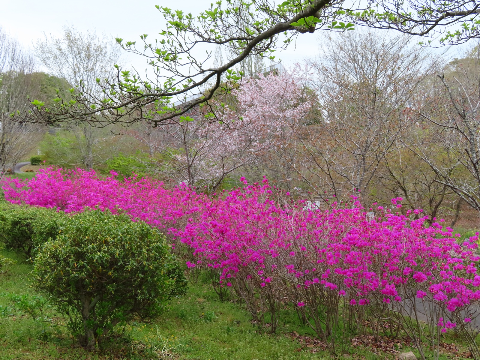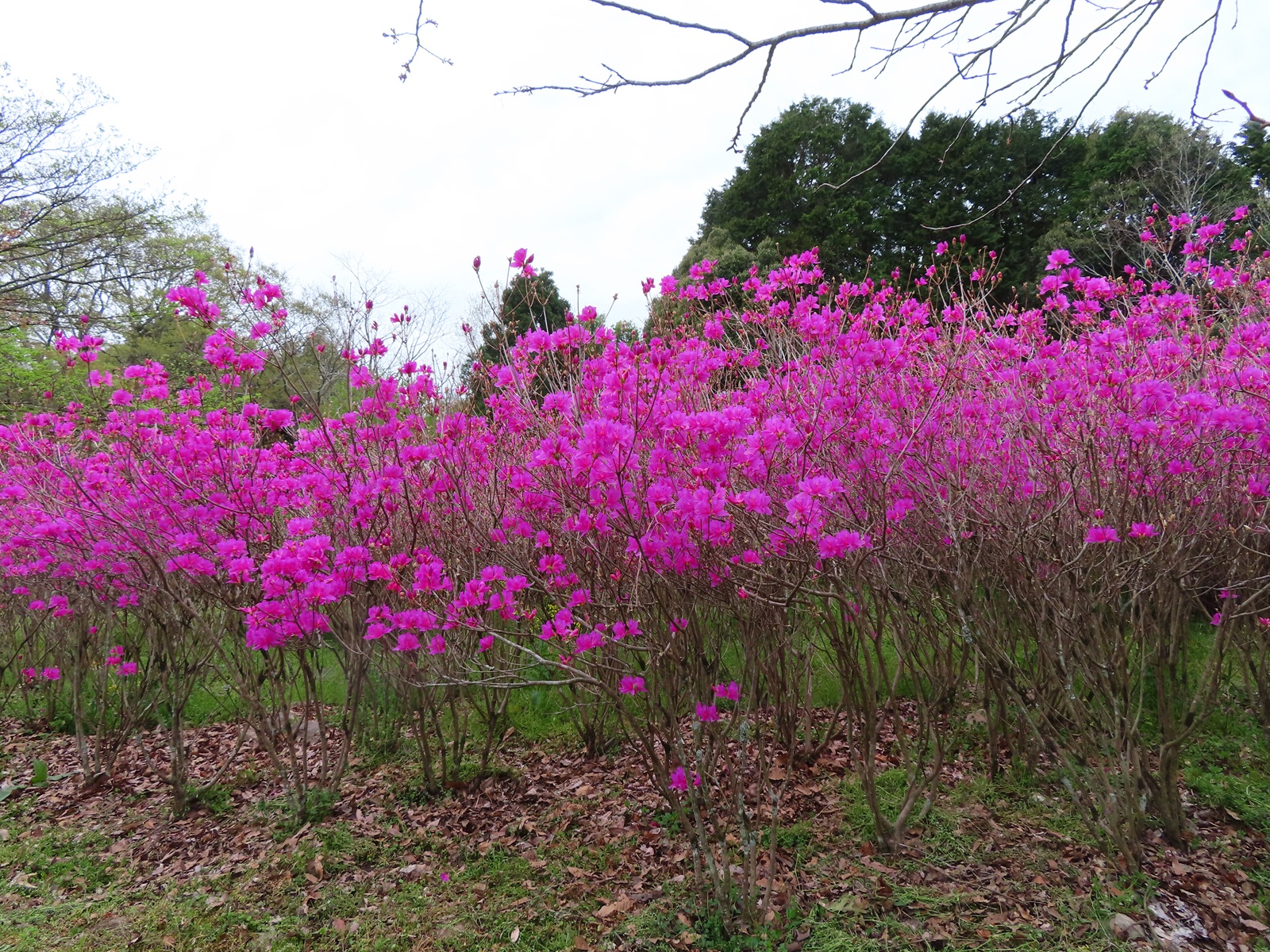 2026.04.09 ムラサキサンヨウ(紫三葉)満開! おはようございます。令和8年4月9日(木)大分県杵築市・るるパーク(大分農業文化公園)は9:30に開園しました。今は薄曇り、雨はまだ降っていません。 正面ゲートから右に徒歩1分・棚田の上では大分県のツツジ・ムラサキサンヨウ(紫三葉)が満開になっています。大分県温泉熱花き研究指導センター(現農林水産研究指導センター農業研究部花きグループ)が開発し、1992年に大分県品種登録されたそうです。 咲いている期間が短い花なので早めの鑑賞をおすすめします。