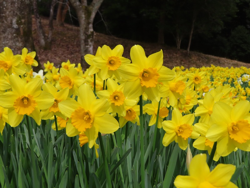 正面ゲートから建物に沿って右に行くと徒歩3分でハーブガーデンに到着しますが、その手前ではラッパスイセンが5~6分咲き、見ごろとなっています。もちろん無料でご覧いただけます。