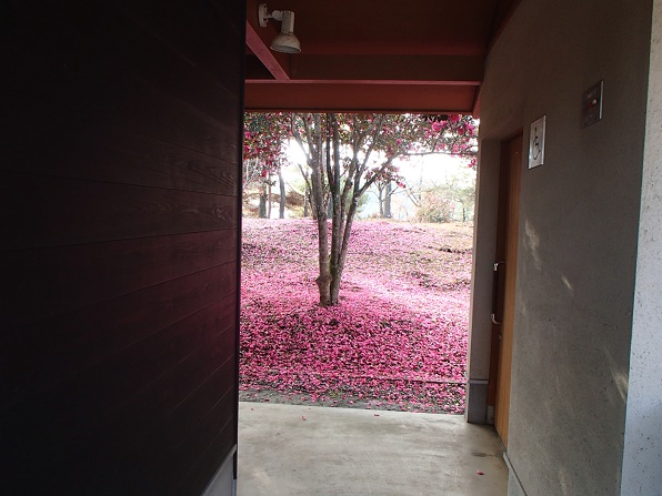 サザンカです。花びらが落ちて、一面真っ赤です。