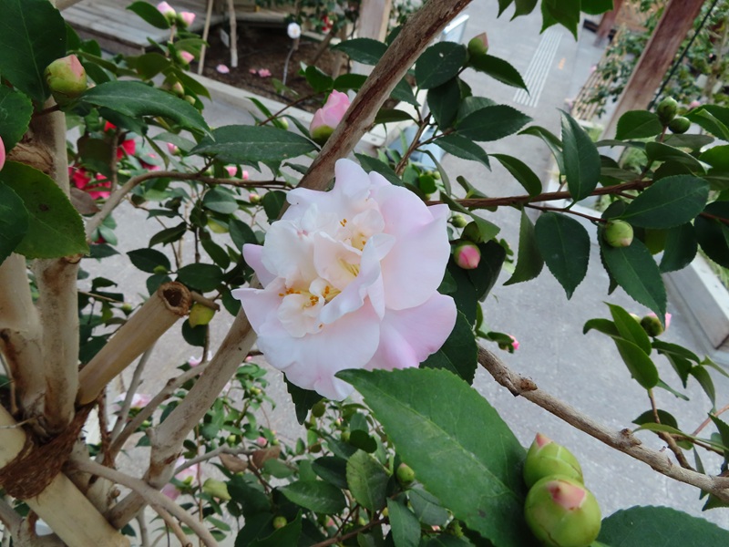 正面ゲートから左に徒歩3分・屋内つばき園は約50品種が開花、見ごろを迎えています。バリアフリーなので車いすや手押し車、ベビーカーをご利用の方もゆっくり鑑賞できます。鑑賞は無料です。皆様のお越しをお待ちしています。
