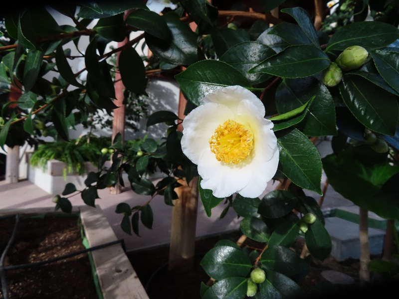 屋内つばき園で「舞吹雪(Mai-fubuki)」「あゆみ白(Ayumi-jiro)」咲き始め