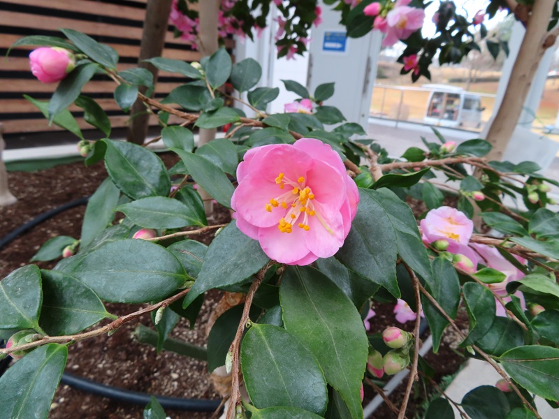 正面ゲートから左に徒歩3分・屋内つばき園では約100品種のツバキを栽培しています。そのうち45品種程が開花していていい感じ!2月14日(土)から「椿まつり」が始まるのでほっとしています。