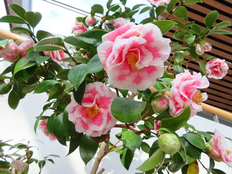 正面ゲートから左に徒歩3分・屋内つばき園は3月9日(月)現在約40品種が開花しています。全体としてはピークアウト中なのですが、咲き終わった品種もあれば今まさに見ごろの品種もあります。今日は開花中のものから2品種をご紹介します。