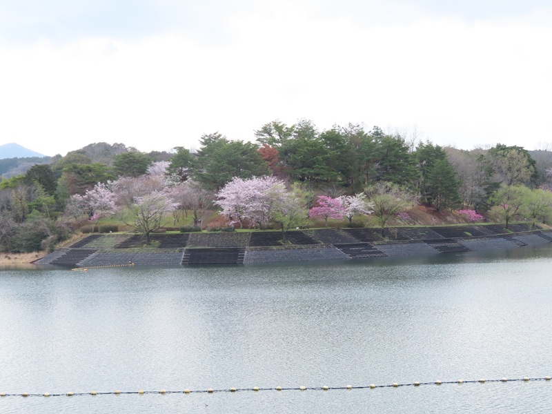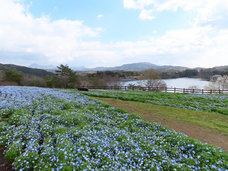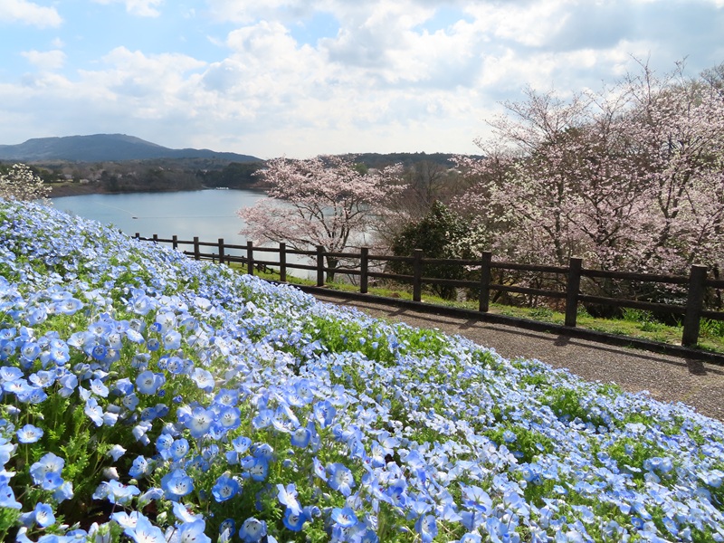 ▼ネモフィラ&サクラ&日指ダムのコラボレーション(ダム湖側斜面で撮影)