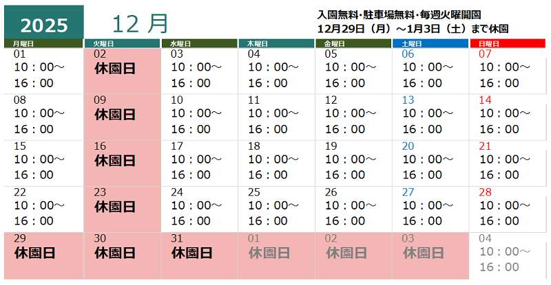 12月~2月は営業時間が冬時間10:00~16:00になります。休園日はいつもどおり毎週火曜日ですが、年末年始12月29日(月)~1月3日(土)も休園させていただきます。あらかじめご了承ください。