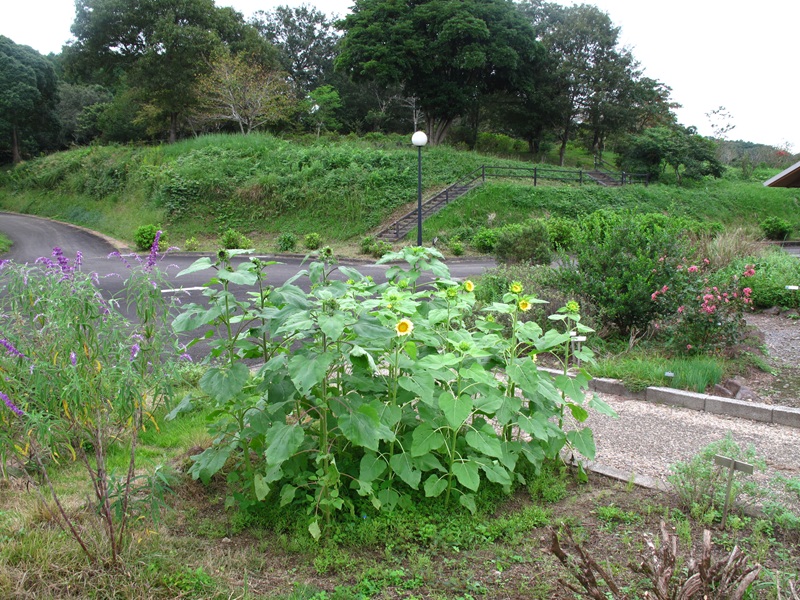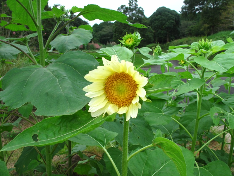 正面ゲートから右に徒歩3分・ハーブガーデンで白いヒマワリが咲き始めています。全部で20本程度、2メートル×2メートルくらいしか植えていませんが白いヒマワリは珍しいのでご紹介しますね。来週には咲きそろうと思います。