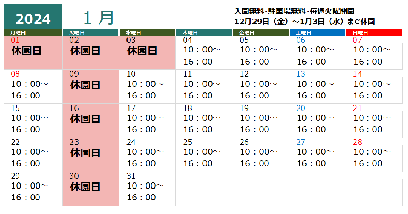 るるパーク(大分農業文化公園)12月~2月の開園時間は 10:00~16:00 、休園日は毎週火曜日、入園無料・駐車場無料です。
