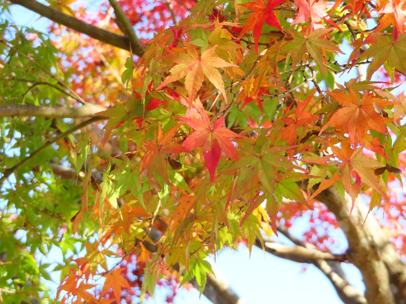 正面ゲートから徒歩1分の場所に「もみじ谷」があります。県内の紅葉名所に比べると小さなスポットですが秋ならではの光景をご覧ください。今日現在3割程度の色づきで、緑から赤へのグラデーションです。木によっては全体が青紅葉のものもあります。