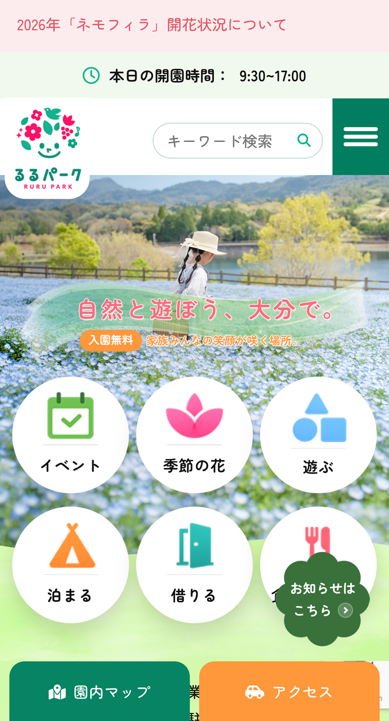2026.04.01 お知らせ花情報サクラ Cherry blossomsネモフィラ Nemophila ホームページをリニューアルしました&ネモフィラSeason8!4月1日のネモフィラ・サクラの様子もお届け 詳細を見る