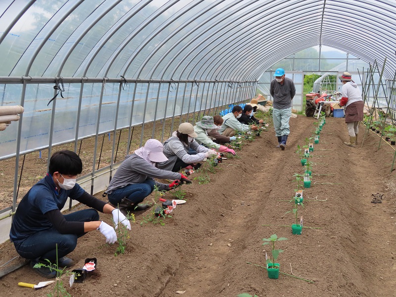 キュウリ・ミニトマト・ナス・ピーマンを定植し、プランターにはコマツナの種をまいていただきました。