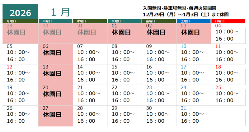 営業時間のお知らせ(入園無料・駐車場無料・営業時間10:00~16:00・毎週火曜休園・釣り禁止区域はこちらで確認してください)